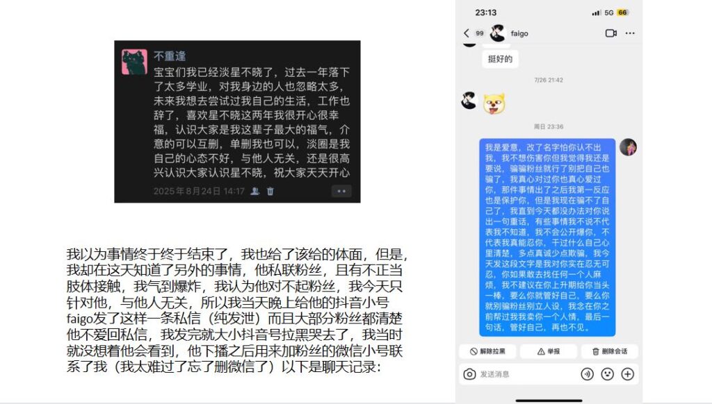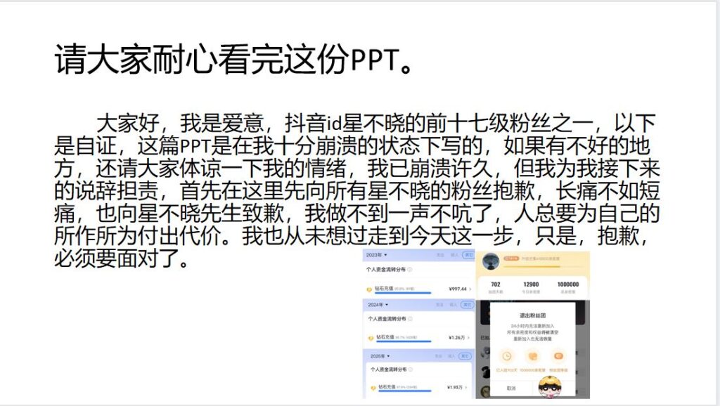 这位男网红打着“单身”人设,靠粉丝打赏维持流量,却在学校里与女生暧昧不清,还与榜一那位女粉保持若即若离的关系。后来那位榜一女粉揭露真相,发布长文并配上PPT,愤怒指控他是个两面派渣男。如今,这位在抖音拥有280万粉丝的男网红疑似已“塌房”。