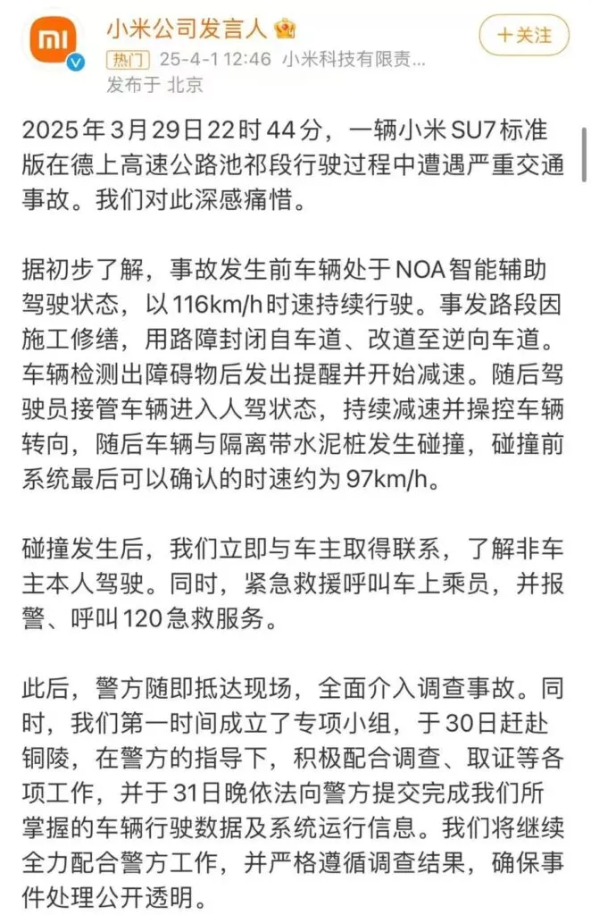 小米旗下新能源汽车自上市以来一直备受各方面关注,话题热度至今热度不减。一辆在安徽铜陵高速行驶的小米su7遭遇智驾失控事件,导致车辆装上防护栏,瞬间期货爆燃,车上乘客均已遇难。
