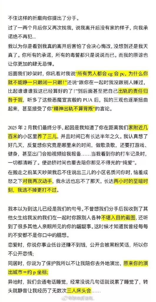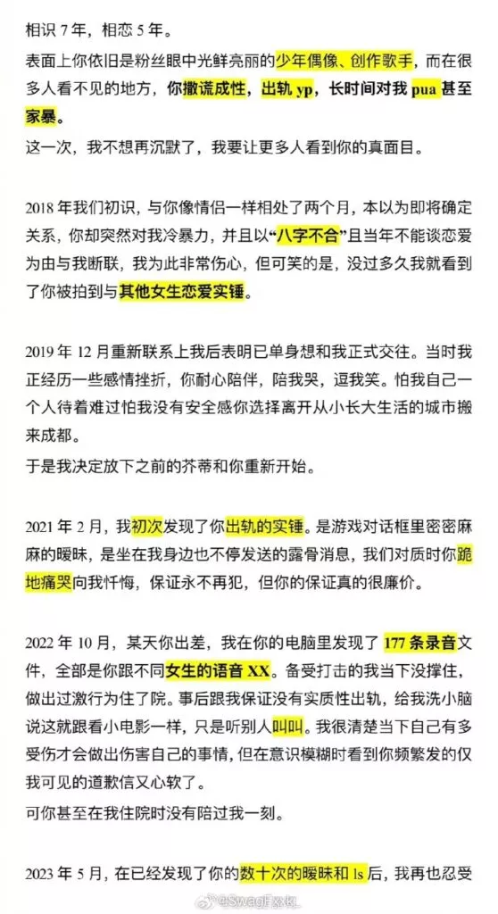 内地新晋小鲜肉歌手,《明日之子》冠军歌手孟子坤,近日突然被女友开撕。其女友曝料,自从2018年相识的之后,在热恋的5年中,孟子坤长期对女友高压态度对待,长时间pua女友以及多次出轨约炮粉丝。