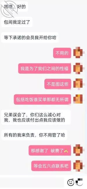 海友兄弟下午那会给我发了信息,表示包间订好了,选了一家比较隐蔽环境较好的地方,这个兄弟给我的感觉,很有素质,很诚心,也是个做大事的人,那种稳重会办事装不来的,刚才还给我开了会员(下面有聊天记录)