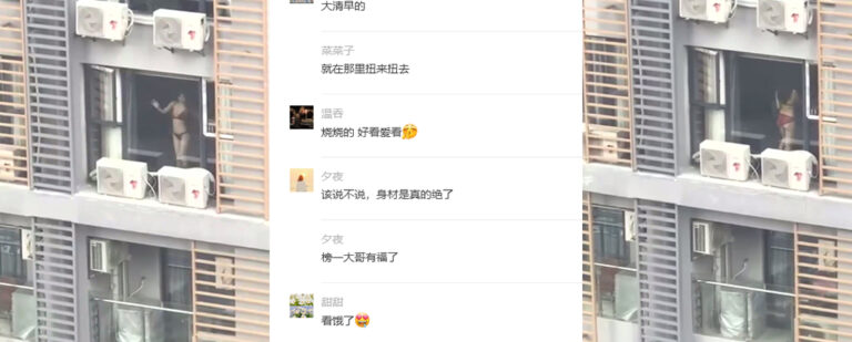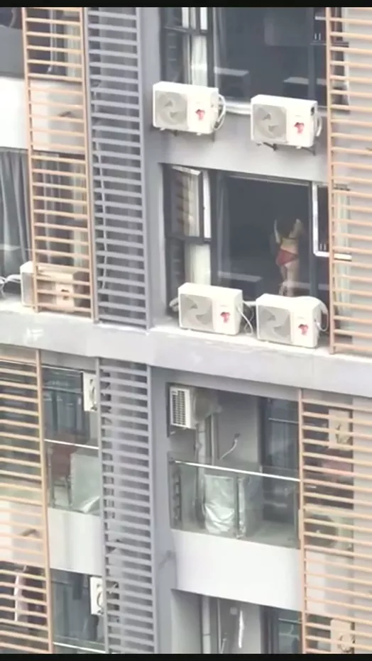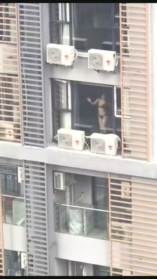这是什么高档小区,早起还有这种攒劲的节目来提神,清凉美女阳台上搔首弄姿展示好身材,隔壁邻居恨不得再架一个望远镜。