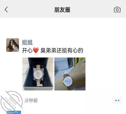 老姐试了几款,最后挑了个阿玛尼的表(品牌的东西溢价太严重了,特么一个石英表竟然要一千五,这还是打完折之后的价…)虽然我觉得这表不值这个价但还是大方的结了账,逛了一会电影开场,我俩去看完电影就回家了,本来想再逛一逛的,奈何七夕出来逛街的人巨多!我俩都不太喜欢人多的环境就打道回府了.今天一共消费一千九百多大洋,晚上回家我洗完澡躺床上玩手机,忽然看到老姐发了个朋友圈我一看这不是机会就来了么,晚上回家想跟老姐亲近亲近聊聊天,正愁找不到理由呢,我马上翻身下床去敲老姐的屋门.