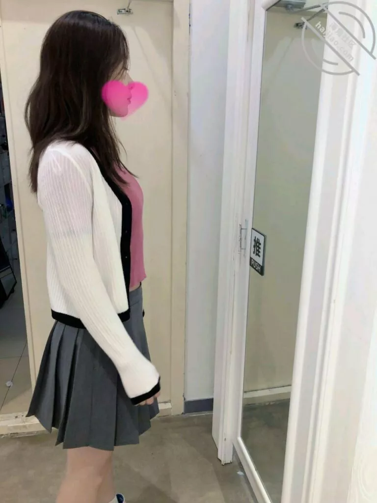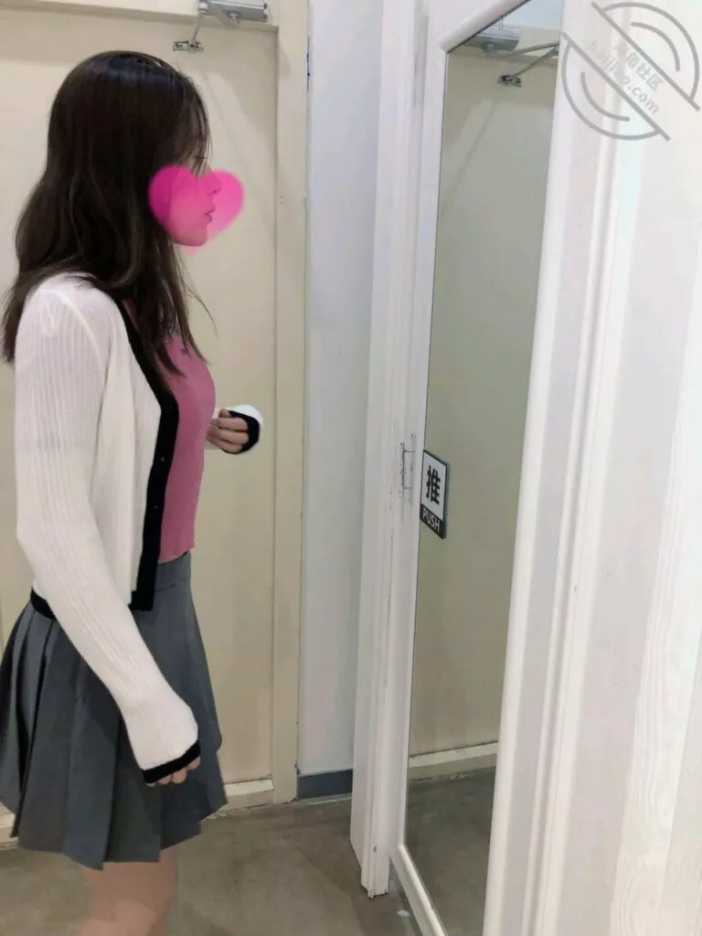 我俩在商场服装区逛了一会,柜员给老姐推荐了一套搭配灰色短裙和白色上衣的搭配,老姐去试衣间换衣服