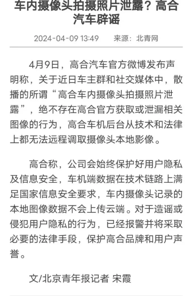 高合汽车在其官方微博上发布声明,驳斥了近期在车主群和社交媒体上流传的“车内摄像头拍摄照片泄露”的说法。高合强调,公司没有获取或泄漏相关图像,车机后台也无法远程调取摄像头本地影像。高合始终重视用户隐私和信息安全,车机数据符合国家规定,车内摄像头的图像数据不会被上传至云端。对于捏造事实或侵犯用户隐私的行为,公司已报警并将采取法律手段保护品牌和用户的声誉。